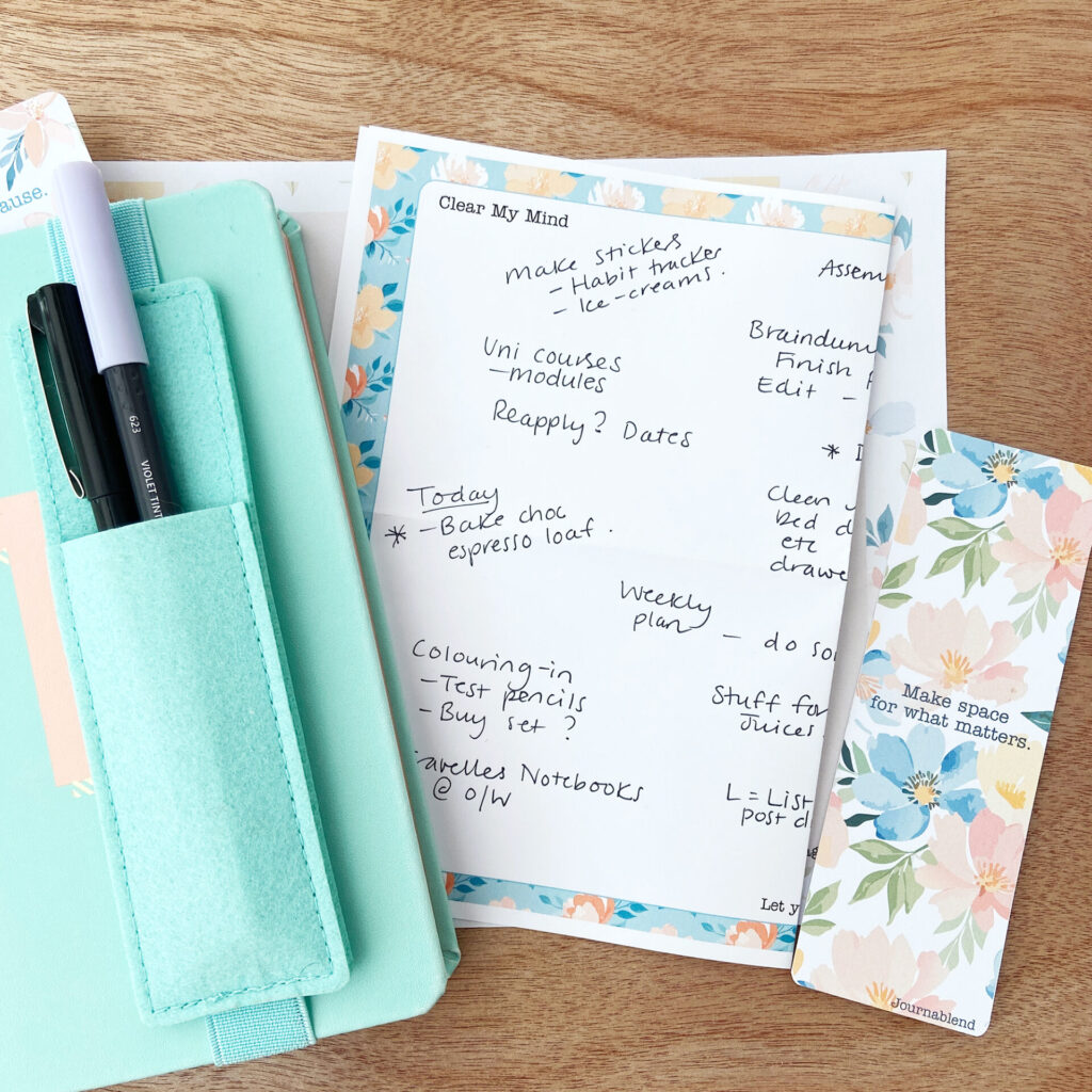 This is how I move between my Dated Planner (this year it’s a Classic Happy Planner with the Dashboard layout) and my Daily BlendBook (currently an A5 lined notebook). Together, they make up the heart of my planning flow – what I call Journablend. My flow follows three simple steps: Braindump → List → Engage, with Nourish and Daily coming in later through my evening and wellness routines.