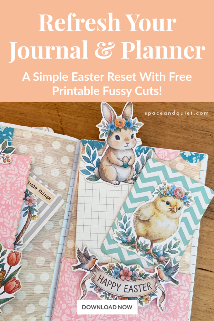 This post will guide you through a step-by-step Easter / seasonal reset, with ideas for journaling, planner reflection, and a little creative play – plus a free page of whimsical fussy cuts to make your journal or planner extra joyful!