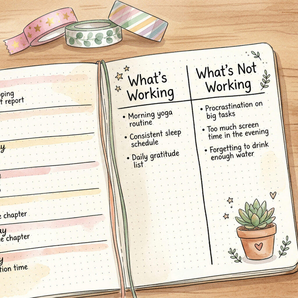 Next, reflect on your current routines, habits, and plans. Create two simple sections on your page: