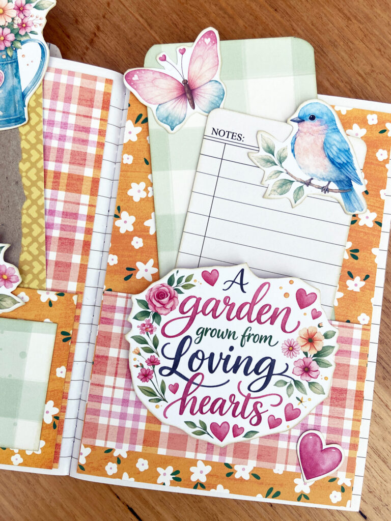 For this spread, I combined the printable fussy cuts with scrapbooking papers from my craft stash. I cut the papers into layered backgrounds, added small pockets to tuck in journaling cards, and used word strips from this printable kit to anchor the page. I like working in layers and moving pieces around until everything feels balanced. It’s a slow, intuitive process, and I find it deeply calming. (This is an affiliate link, which means I may earn a small commission at no extra cost to you.)