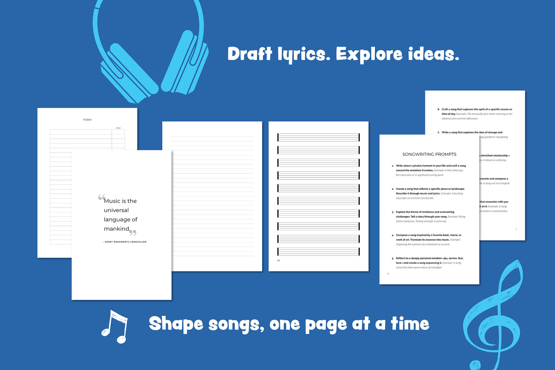 Inside, you’ll find lined pages for writing lyrics, notes, and drafts, alongside 12 music staff sheets for sketching melodies, chord progressions, or musical ideas as they take shape. It’s designed to support your real songwriting process — from first lines and half-formed thoughts to more developed pieces.